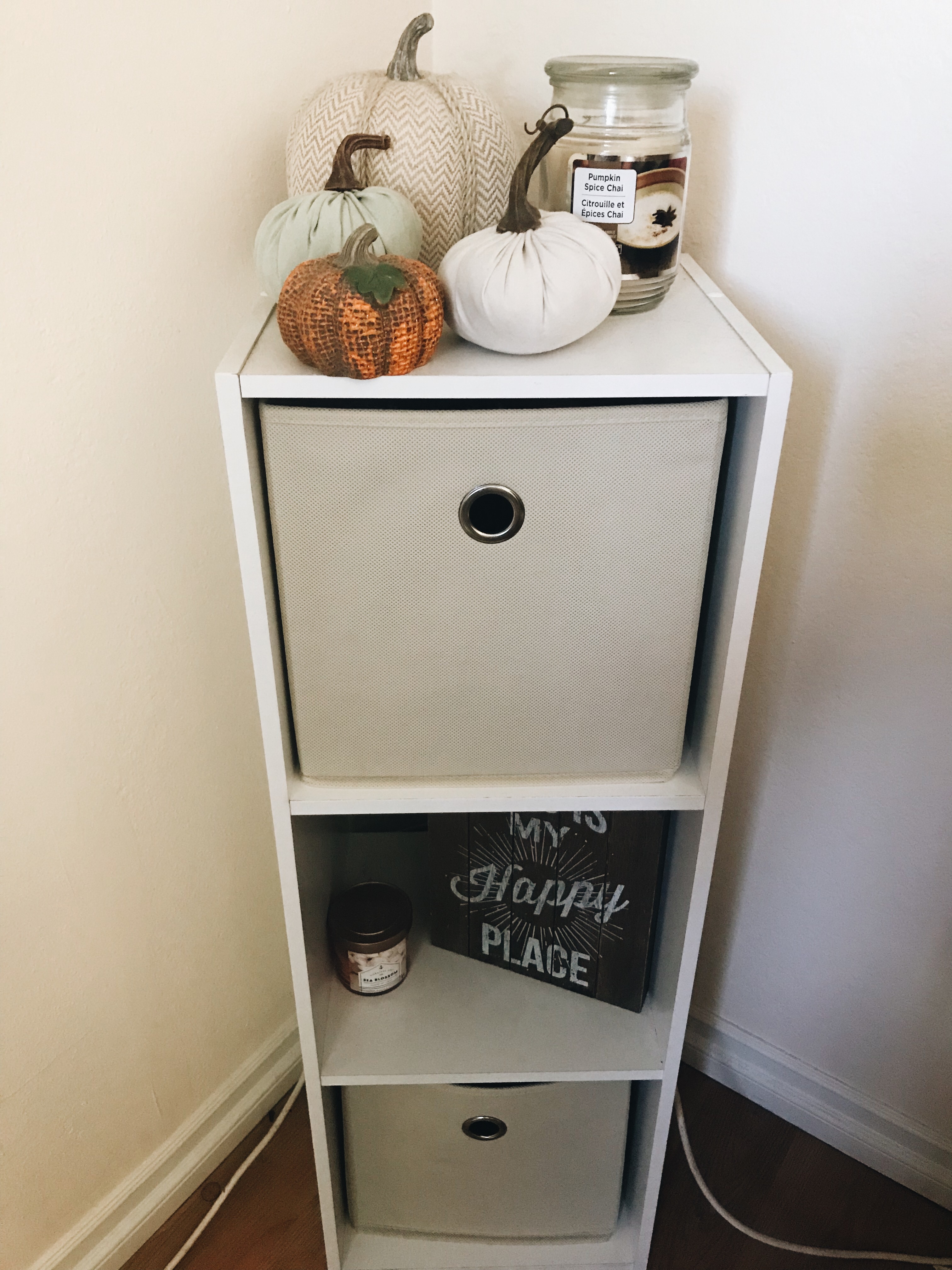 This was also something I just wanted to show that I got because it’s cute and it was cheap! I got this from target and it was $25 (not including the bins that were $5 each). I needed something to go in this corner and also a place to put all the random stuff in my room like my febreze, laptop case, chargers, etc. I also only bought 2 bins and made the middle just a cute little shelf.