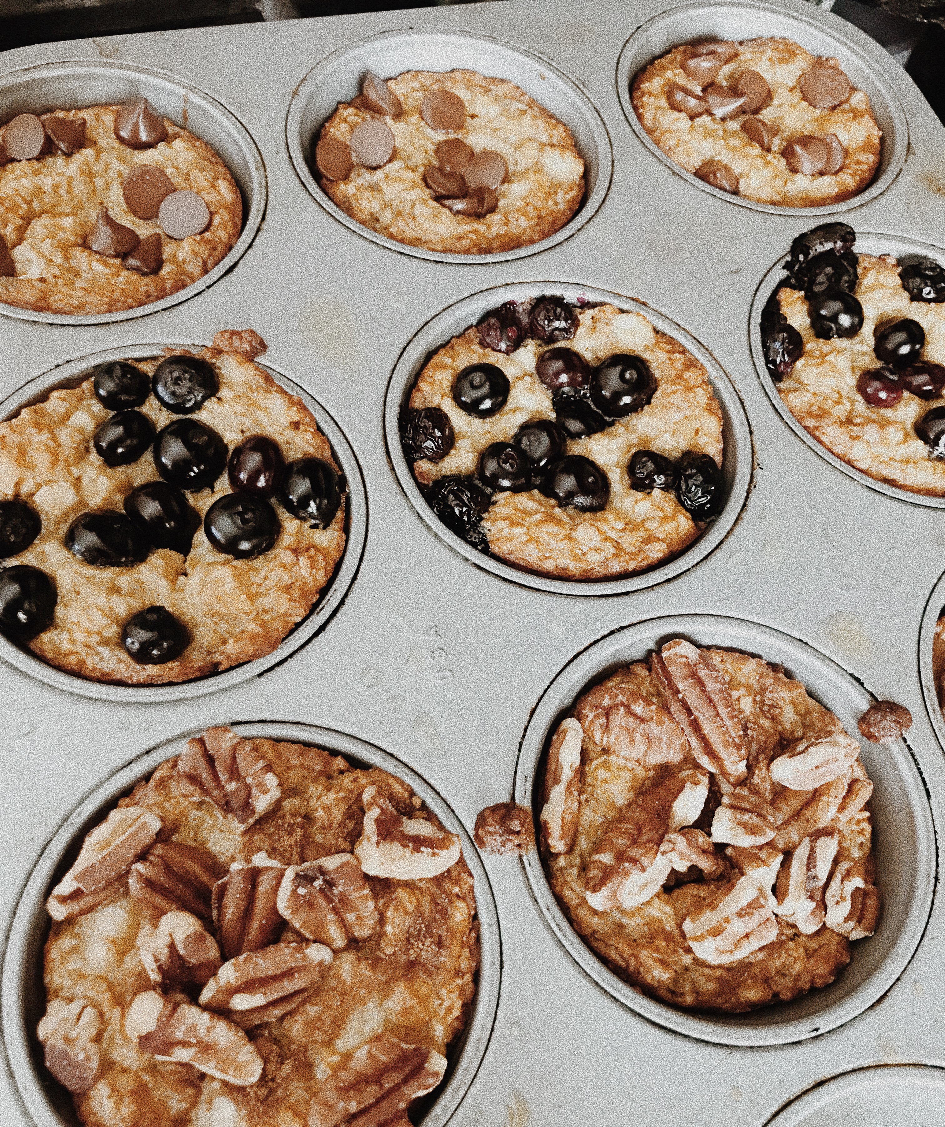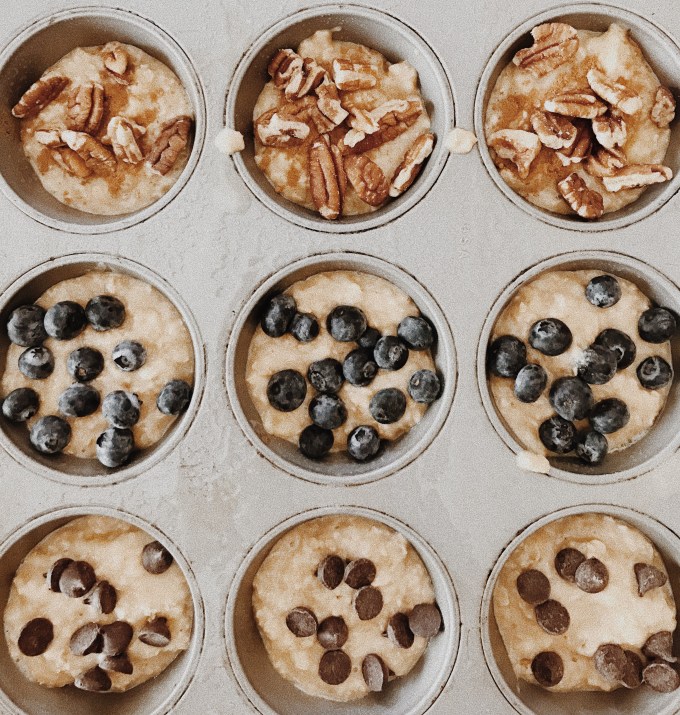 - Pour batter halfway into the muffin tins and add desired toppings!
